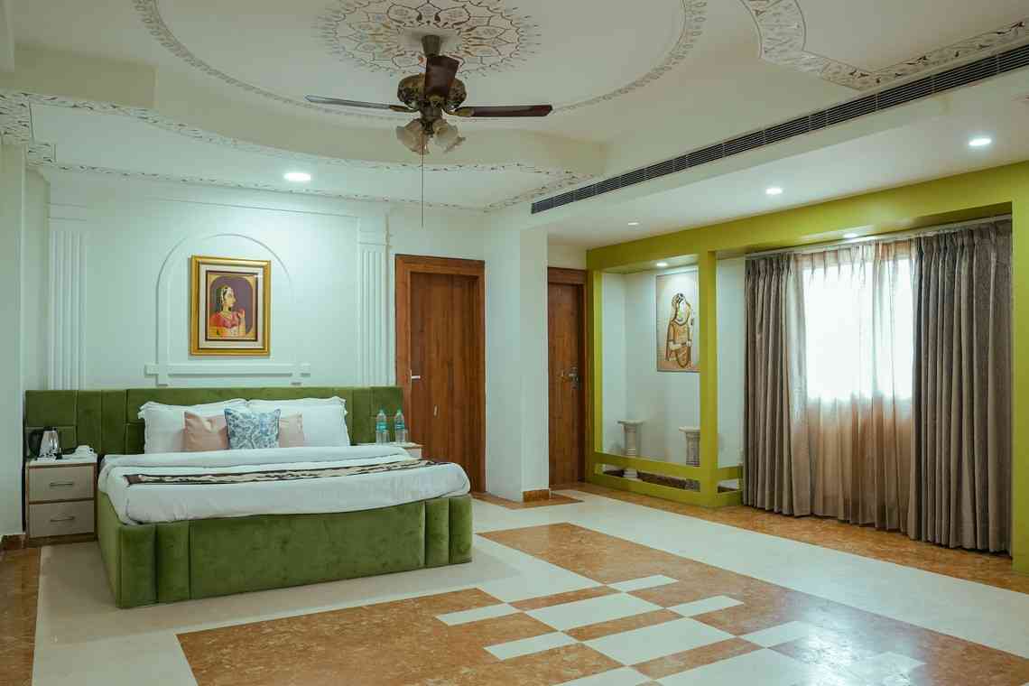 The earthy ambience of these rooms, is in tune with the landscape surrounding them. You can actually feel the nature around you. The attached glass-fronted big windows gives a magnificent view of the Peacock garden.